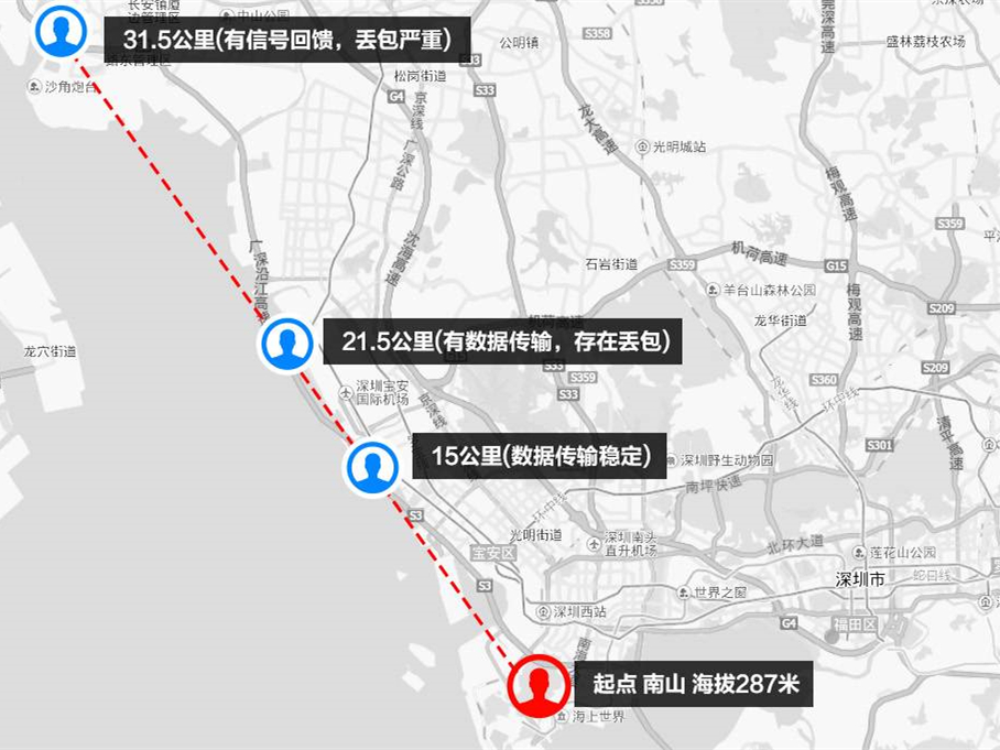 本次LoRa空空平行可視距離測(cè)試區(qū)域的概貌。首先將發(fā)射模塊放置在起點(diǎn)位置,在平行可視距離范圍內(nèi),測(cè)試人員坐車(chē)從前海向?qū)毎参鬣l(xiāng)出發(fā),分別在坪洲新村附近(8.5公里)、福永碼頭附近(15.1公里)、廣深沿江高速S3(21.5公里)、東寶河大橋(31.5公里)等進(jìn)行通訊測(cè)試。測(cè)試起點(diǎn)位于深圳南山的觀景臺(tái)上,其他測(cè)試點(diǎn)和起點(diǎn)之間很空曠,有少量建筑物。