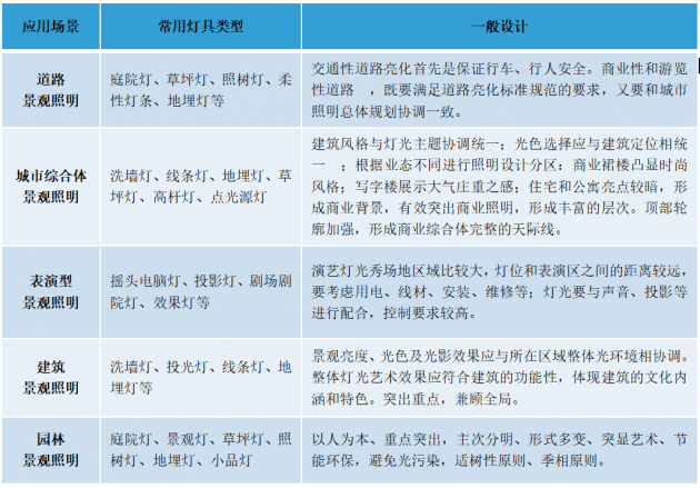 ? ? ? ? 按應(yīng)用場景區(qū)分:大致為道路景觀照明、城市綜合體景觀照明、園林景觀照明、建筑景觀照明、表演型景觀照明等。