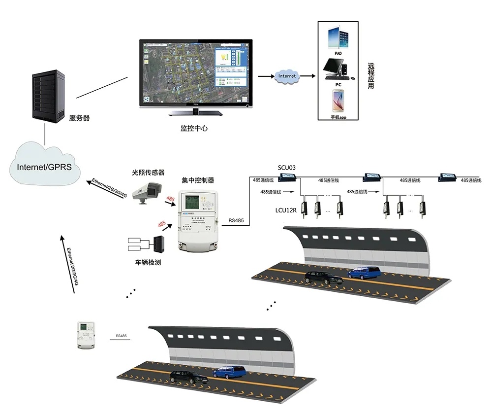 針對高速隧道照明能耗高、控制粗放等痛點,推出以ZB124-K-C單燈控制器為核心的智能照明節(jié)能改造方案。方案配置專業(yè)照明控制配電箱,實現(xiàn)現(xiàn)場人工、自動控制雙模式協(xié)同,預(yù)留遠程控制模塊擴展接口,可靈活切換手動、遙控、時控三種燈具控制方式(常規(guī)工況采用遙控+時控,檢修采用手動)。通過洞外亮度檢測儀與單燈控制器聯(lián)動,基于LED光源無級調(diào)光技術(shù),動態(tài)匹配隧道照明需求,實現(xiàn)“按需照明”的綠色照明目標(biāo),兼顧通行安全與節(jié)能效益。