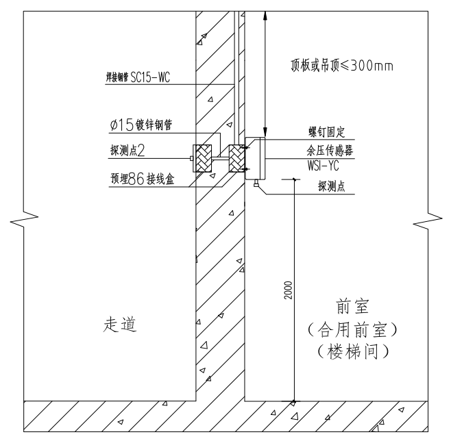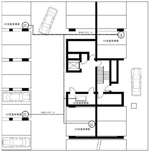 1) CO濃度探測(cè)器安裝在地下車庫(kù)空氣流通的位置,每 300~400平米設(shè)置 1個(gè)檢測(cè)點(diǎn)位,探測(cè)器之間設(shè)置間距≤20m,CO濃度探測(cè)器設(shè)置高度為底